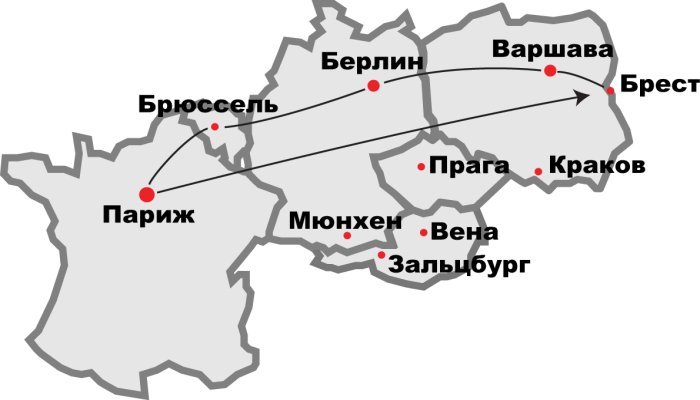 Данный маршрут позволит вам проехать по всей Европе и насладиться в итоге всеми красотами незабываемого Парижа. Для этого сначала следует сесть в поезд на Белорусском вокзале в Москве. После прохождения погранконтроля в Бресте вы пересаживаетесь в комфортабельный автобус, и путешествие начинается!